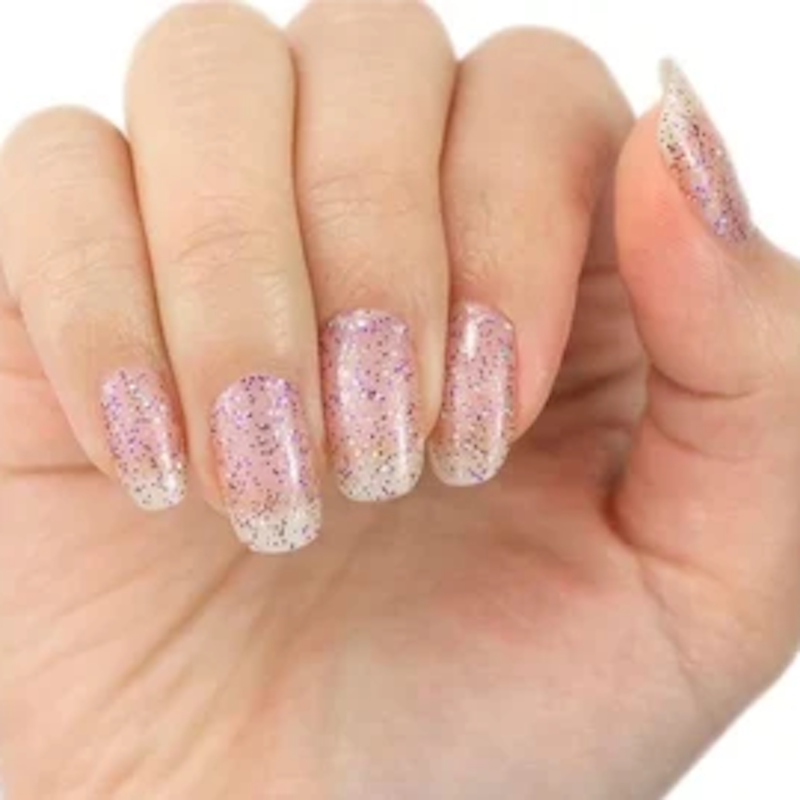 Make any mani sparkle with this clear overlay of holographic and teeny pink glitter.