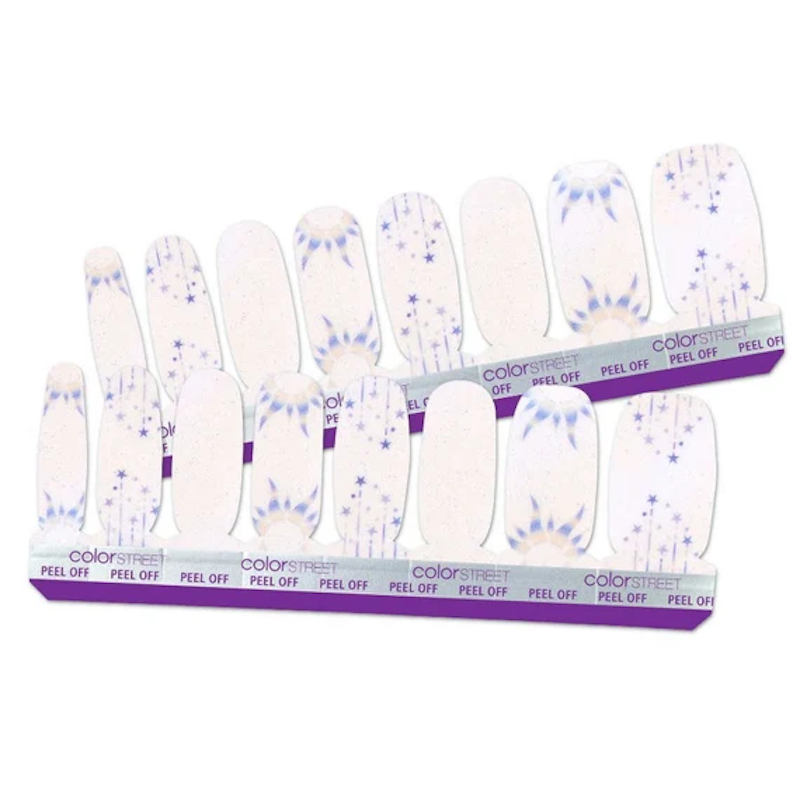 For a celestial vibe, we love Into the Cosmos, a glittery white and periwinkle design of stars and sun flairs!
