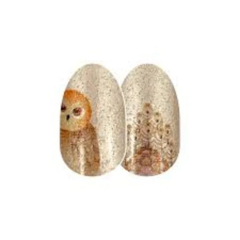 A shimmery gold design, featuring cute owls and their beautiful feathers.