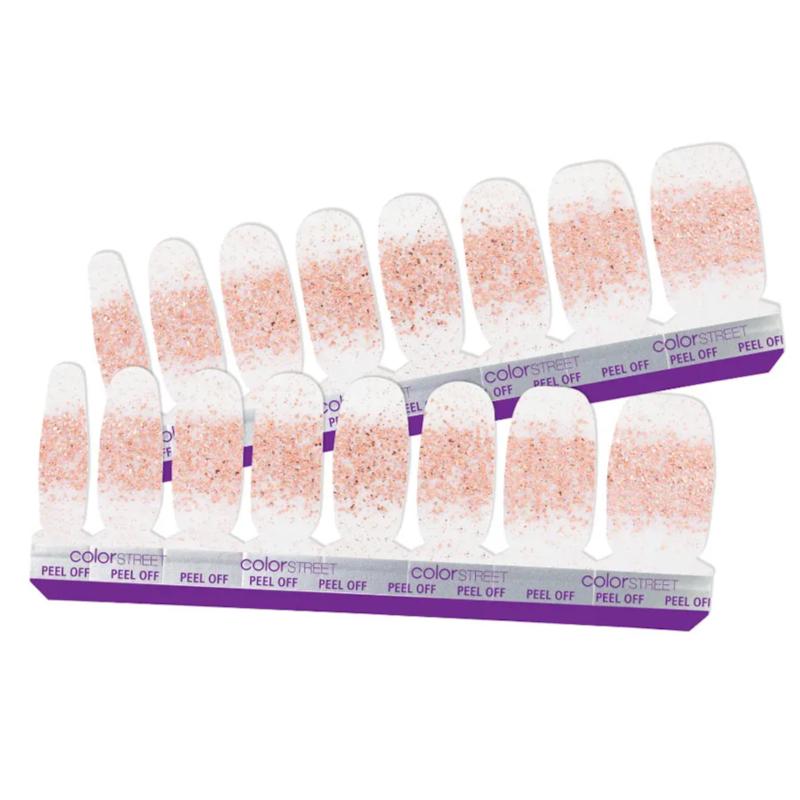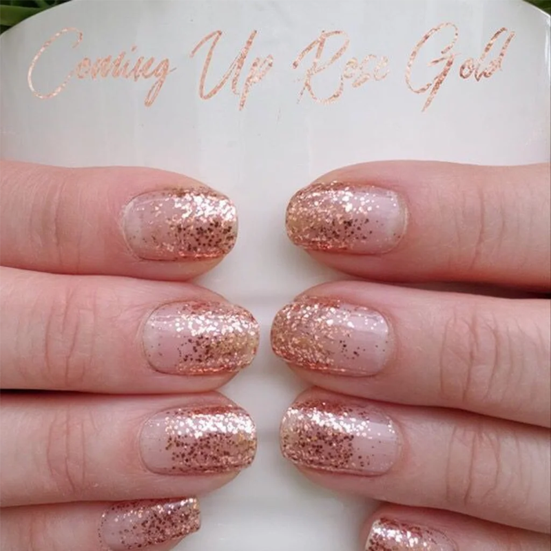 Rose gold sparkle is one step away – just top your tips with Coming Up Rose Gold! Wear these glitter and clear strips alone on bare nails or layer over your favorite nail color for a dazzling effect.